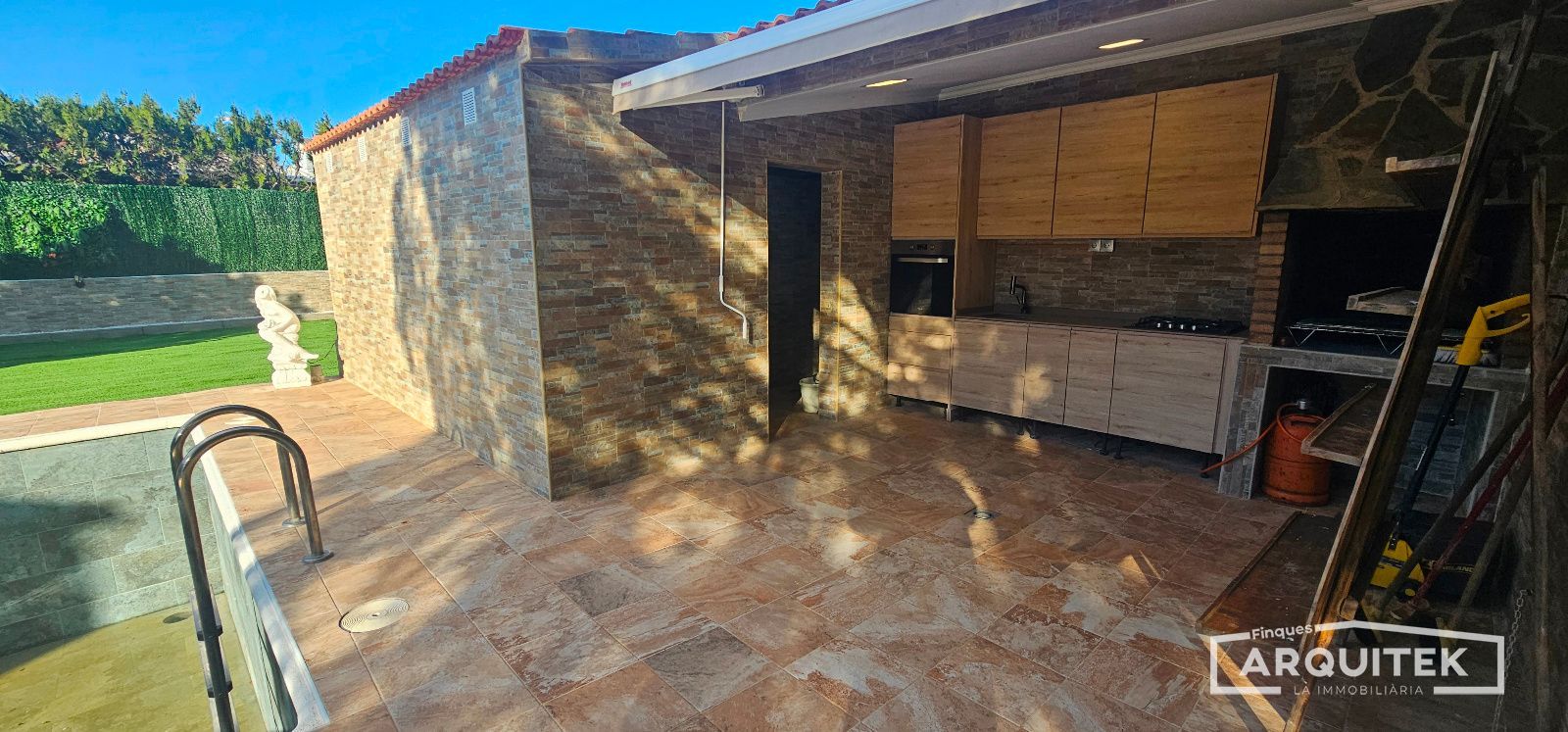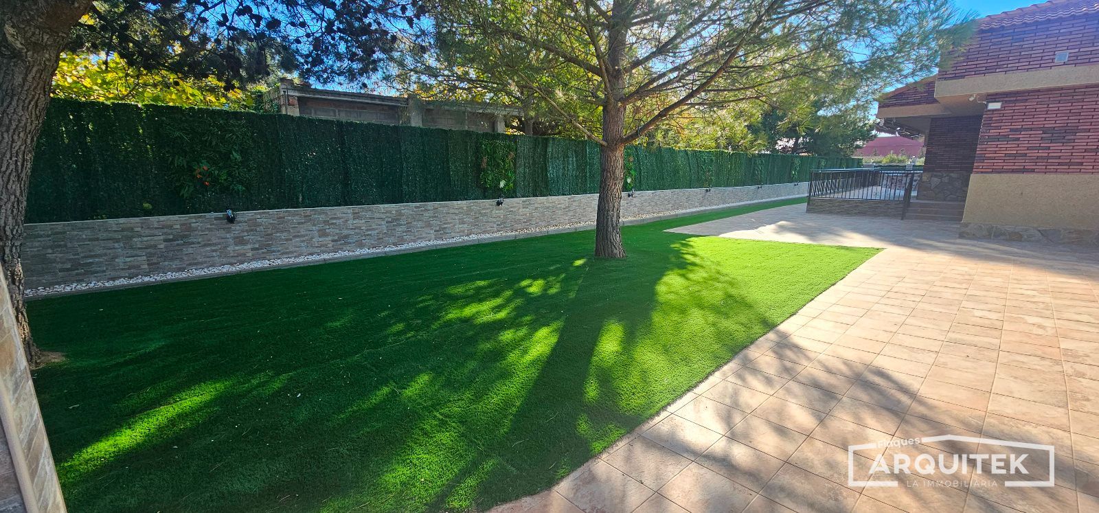 El perímetro de la casa con suelo porcelanico, junto con el césped, hace que la casa sea pràctica y funcional.